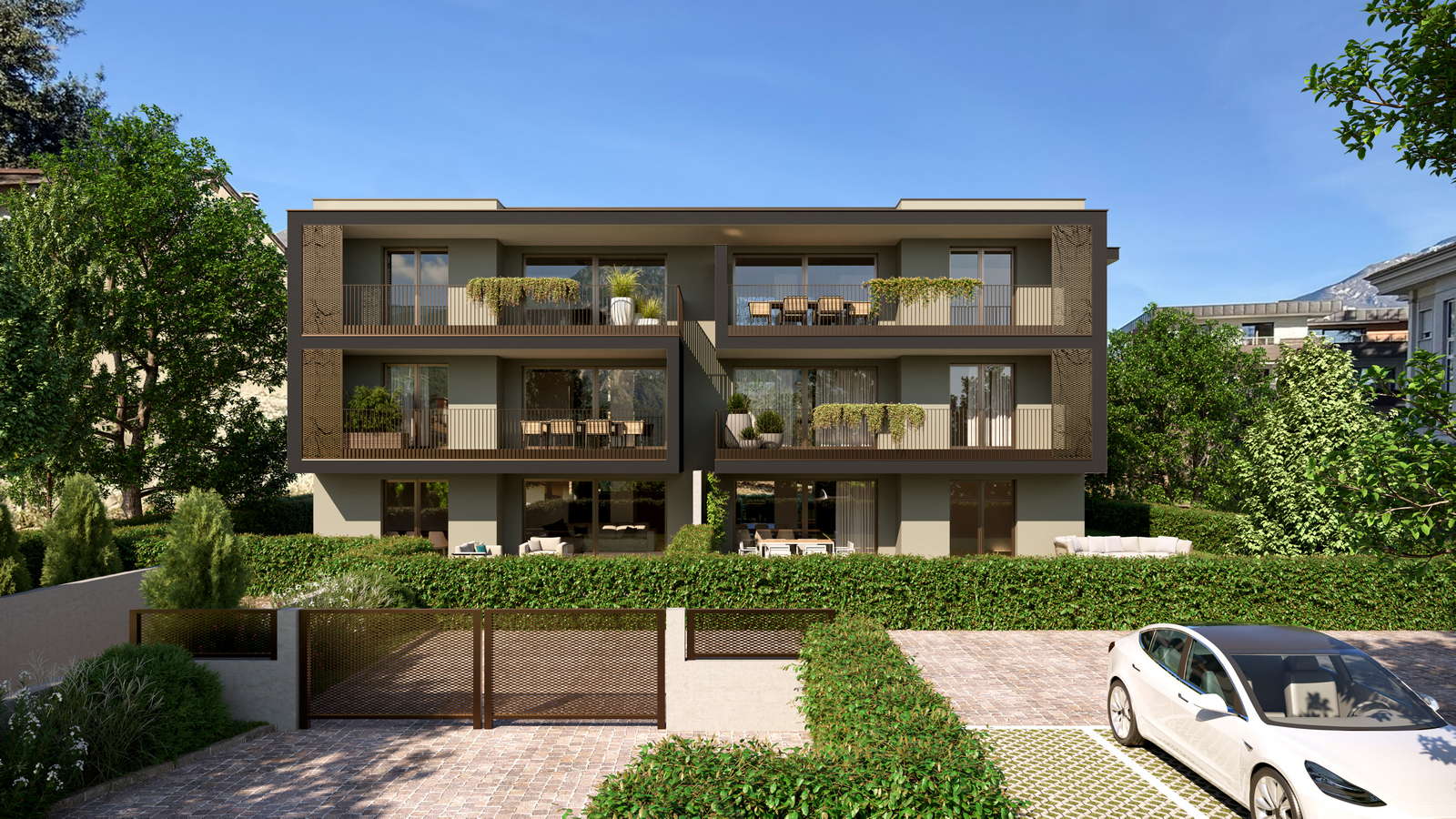 Un unico edificio di tre livelli accoglie sei residenze di alto profilo, ampi trilocali con doppi servizi e balconi generosi, pensati per offrire comfort, luce e privacy.